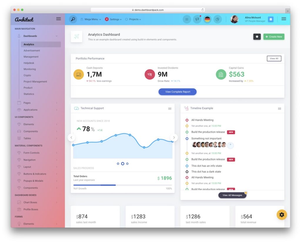 ArchitectUI is a powerful solution that gets the ball rolling with its different layouts, fifteen custom components, and widgets. The template is also 100% responsive and optimized for fantastic performance.